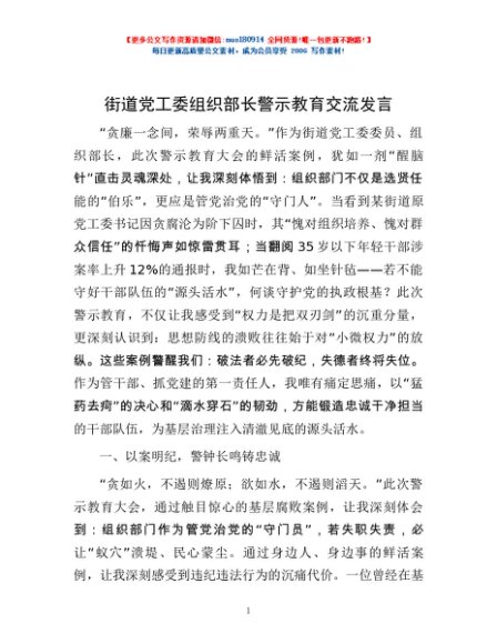 / 街道党工委组织部长警示教育交流发言