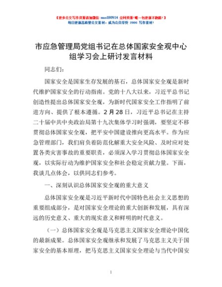 / 市应急管理局党组书记在总体国家安全观中心组学习会上研讨发言材料