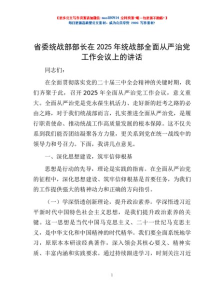 / 省委统战部部长在2025年统战部全面从严治党工作会议上的讲话