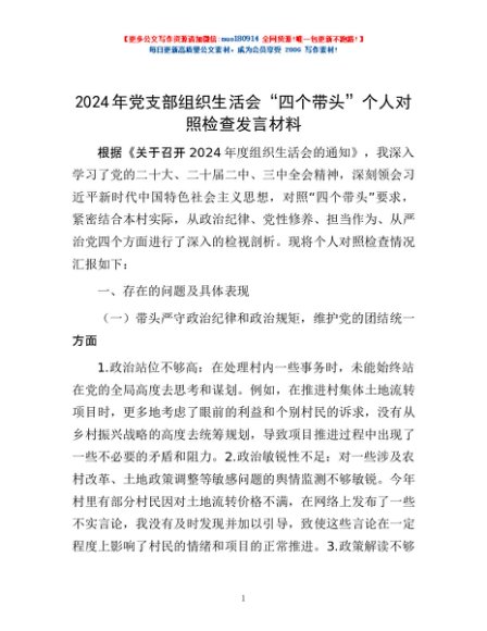 / 2024年党支部组织生活会“四个带头”个人对照检查发言材料