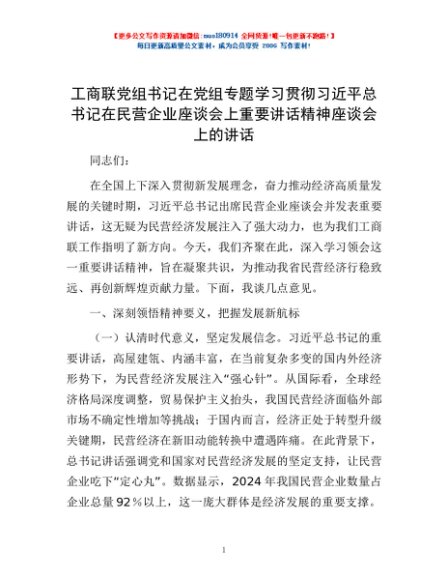 / 工商联党组书记在党组专题学习贯彻习近平总书记在民营企业座谈会上重要讲话精神座谈会上的讲话