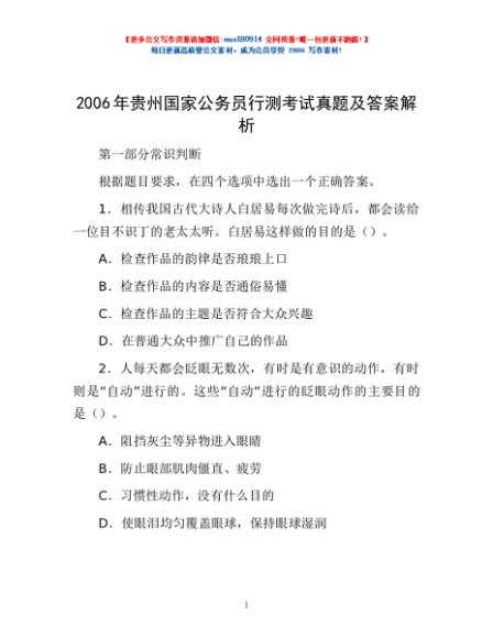 2006年贵州国家公务员行测考试真题及答案解析