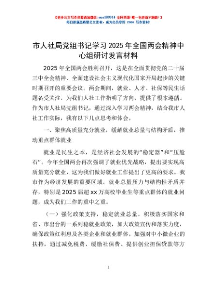 / 市人社局党组书记学习2025年全国两会精神中心组研讨发言材料