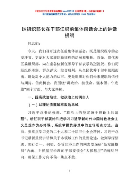 / 区组织部长在干部任职前集体谈话会上的讲话提纲
