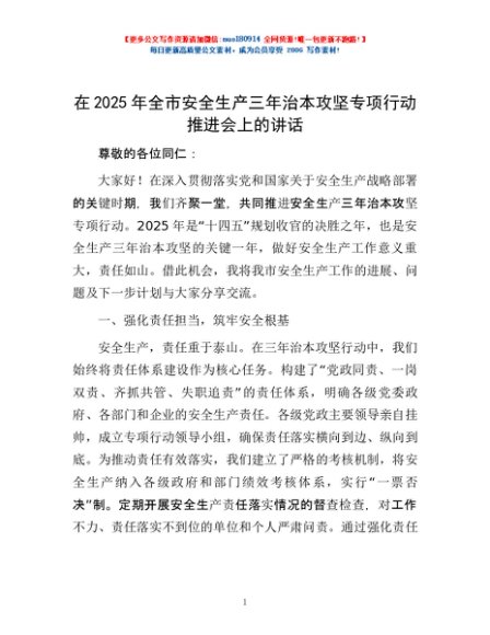/ 在2025年全市安全生产三年治本攻坚专项行动推进会上的讲话