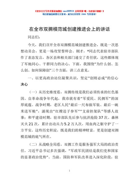 / 在全市双拥模范城创建推进会上的讲话