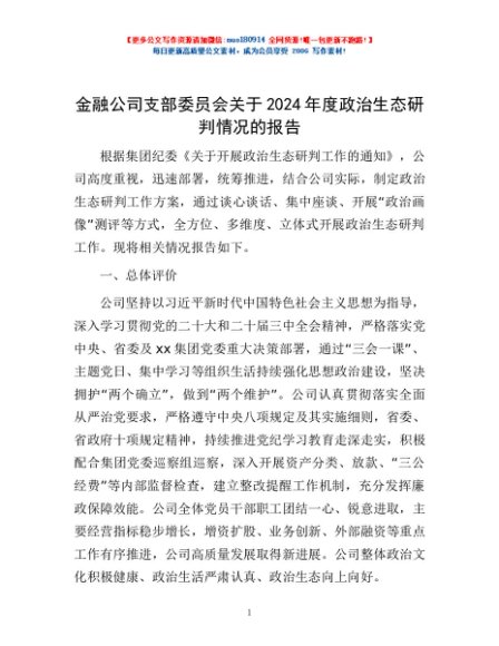 / 金融公司支部委员会关于2024年度政治生态研判情况的报告
