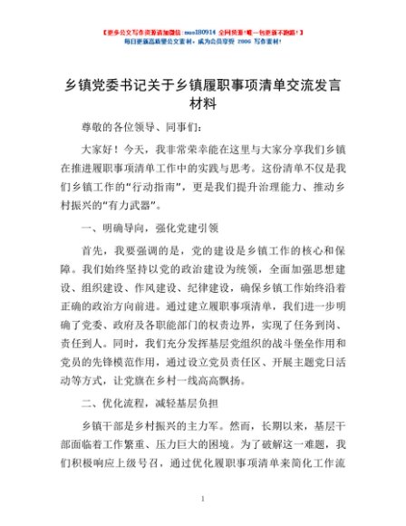 乡镇党委书记关于乡镇履职事项清单交流发言材料