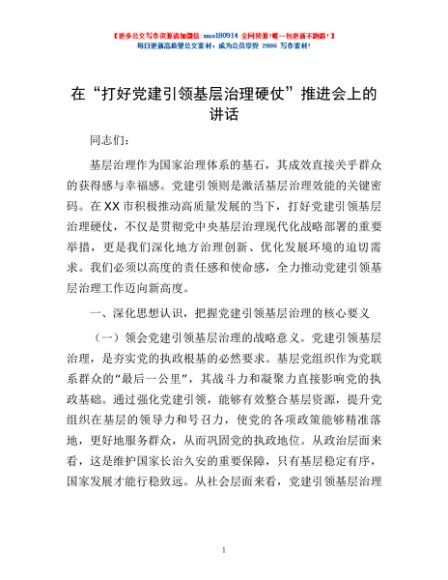 / 在“打好党建引领基层治理硬仗”推进会上的讲话