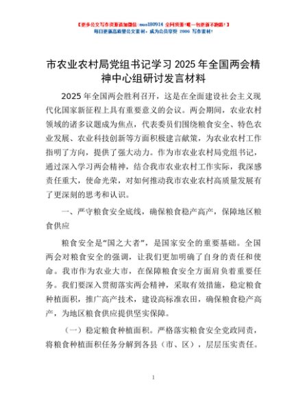 / 市农业农村局党组书记学习2025年全国两会精神中心组研讨发言材料