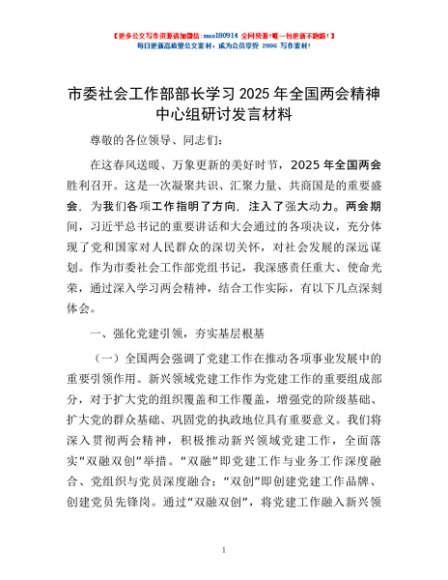 / 市委社会工作部部长学习2025年全国两会精神中心组研讨发言材料