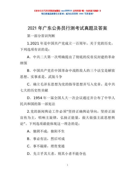 / 2021年广东公务员行测考试真题及答案