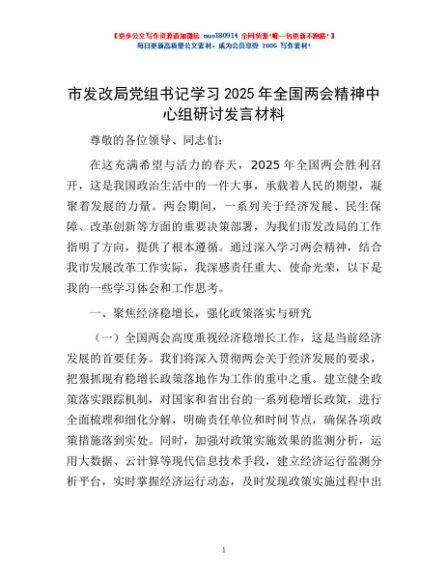 / 市发改局党组书记学习2025年全国两会精神中心组研讨发言材料