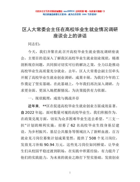 / 区人大常委会主任在高校毕业生就业情况调研座谈会上的讲话