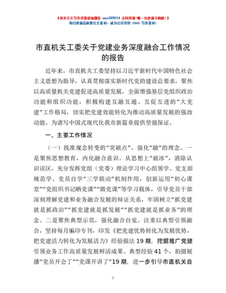 / 市直机关工委关于党建业务深度融合工作情况的报告