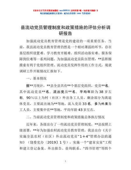 / 县流动党员管理制度和政策措施的评估分析调研报告