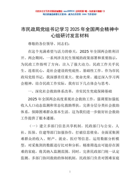 / 市民政局党组书记学习2025年全国两会精神中心组研讨发言材料