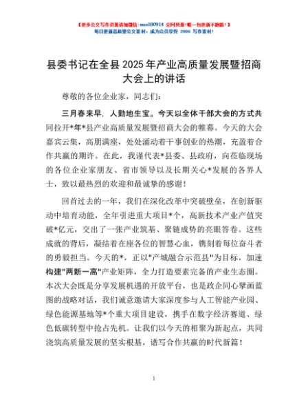 / 县委书记在全县2025年产业高质量发展暨招商大会上的讲话