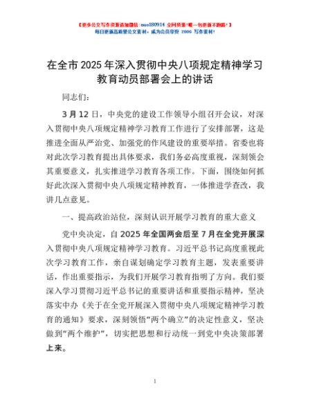 / 在全市2025年深入贯彻中央八项规定精神学习教育动员部署会上的讲话