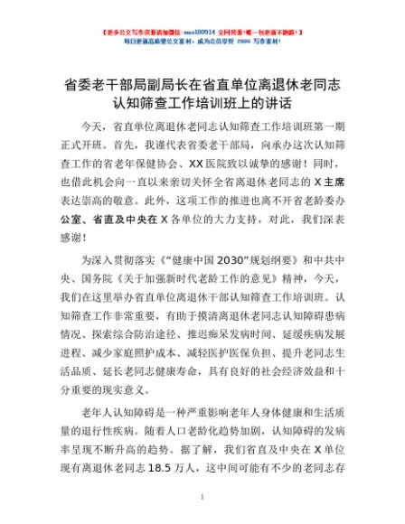 / 省委老干部局副局长在省直单位离退休老同志认知筛查工作培训班上的讲话
