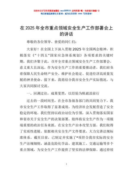 / 在2025年全市重点领域安全生产工作部署会上的讲话