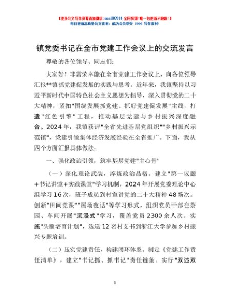 / 镇党委书记在全市党建工作会议上的交流发言