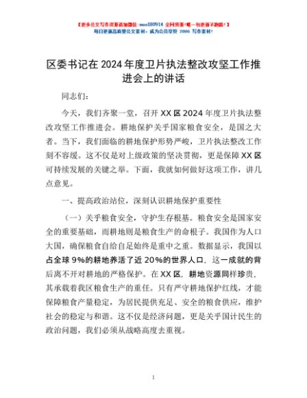 / 区委书记在2024年度卫片执法整改攻坚工作推进会上的讲话