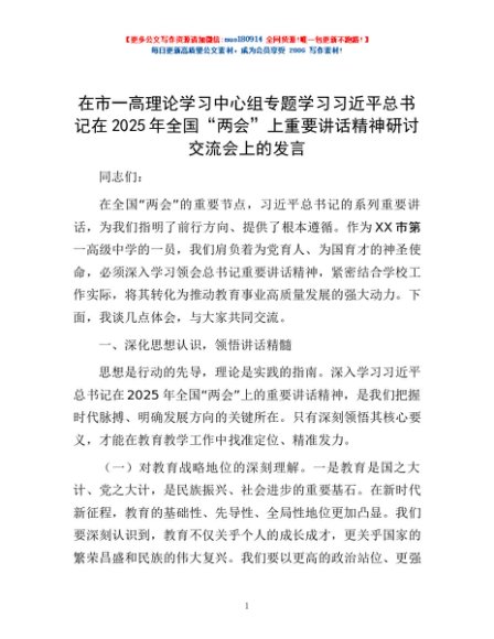 / 在市一高理论学习中心组专题学习习近平总书记在2025年全国“两会”上重要讲话精神研讨交流会上的发言