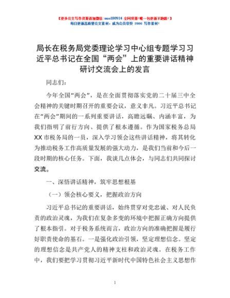 / 局长在税务局党委理论学习中心组专题学习习近平总书记在全国“两会”上的重要讲话精神研讨交流会上的发言