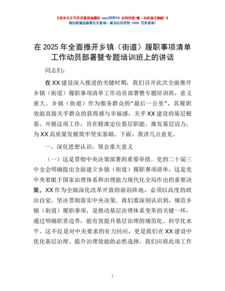 / 在2025年全面推开乡镇(街道)履职事项清单工作动员部署暨专题培训班上的讲话