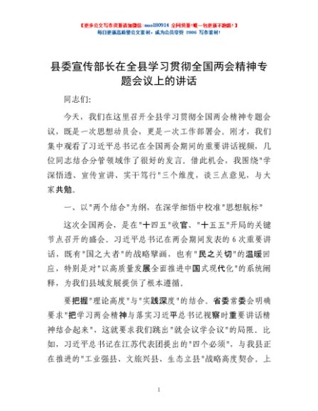 / 县委宣传部长在全县学习贯彻全国两会精神专题会议上的讲话