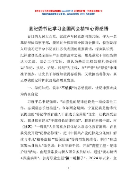 / 县纪委书记学习全国两会精神心得感悟