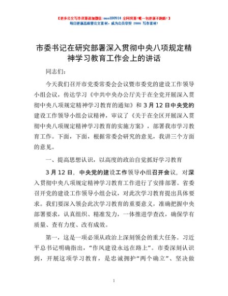 / 市委书记在研究部署深入贯彻中央八项规定精神学习教育工作会上的讲话