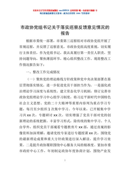 / 市政协党组书记关于落实巡察反馈意见情况的报告