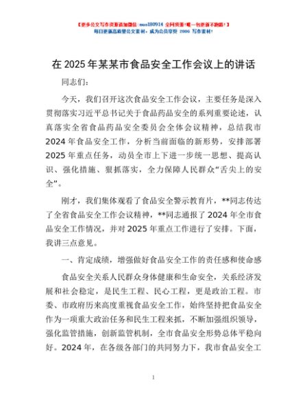 / 在2025年某某市食品安全工作会议上的讲话