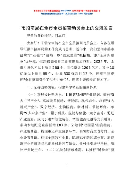 / 市招商局在全市全员招商动员会上的交流发言
