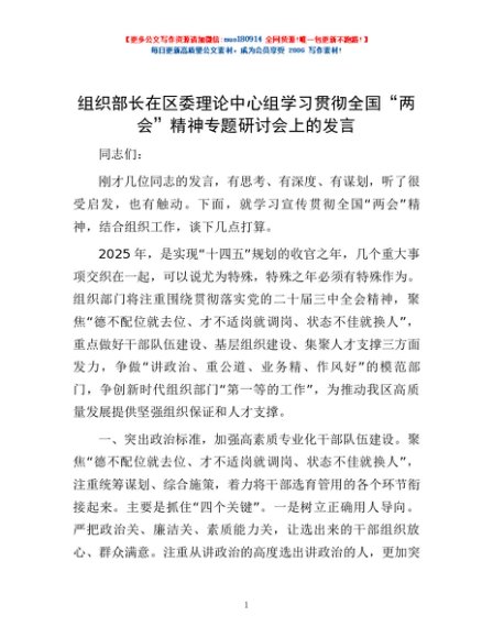 / 组织部长在区委理论中心组学习贯彻全国“两会”精神专题研讨会上的发言