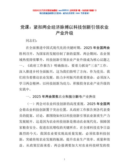 党课:紧扣两会经济脉搏 以科技创新引领农业产业升级