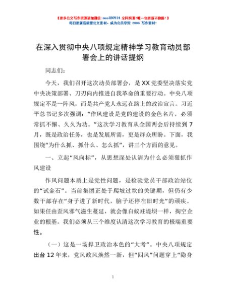 / 在深入贯彻中央八项规定精神学习教育动员部署会上的讲话提纲