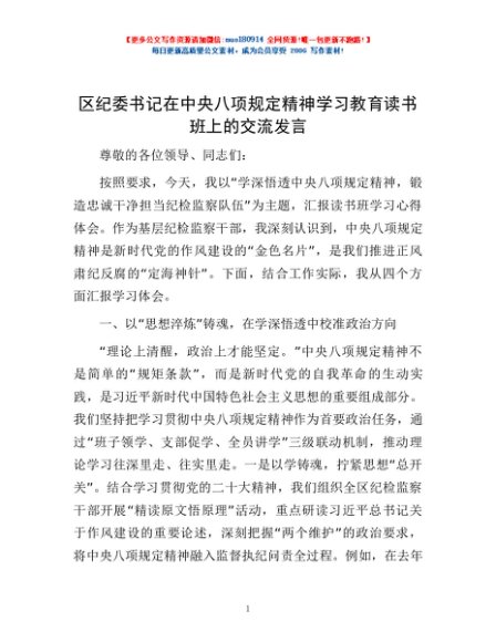 / 区纪委书记在中央八项规定精神学习教育读书班上的交流发言