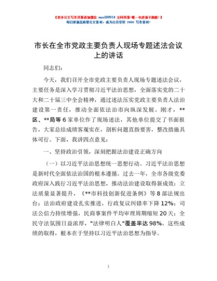 / 市长在全市党政主要负责人现场专题述法会议上的讲话