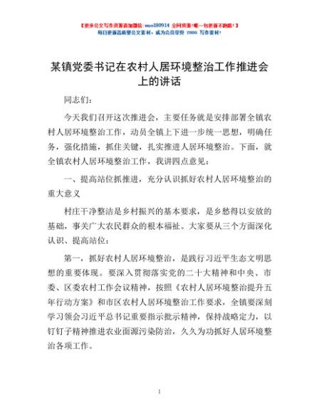 / 某镇党委书记在农村人居环境整治工作推进会上的讲话