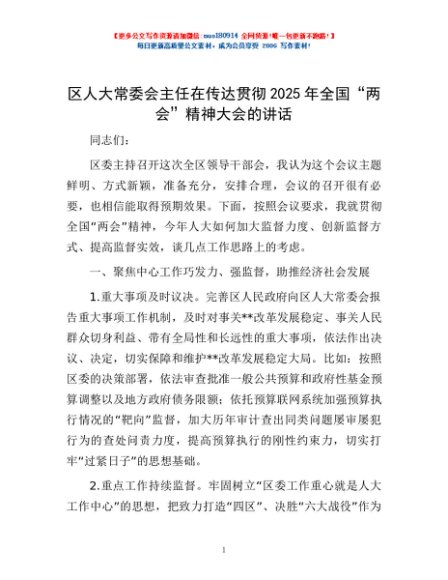 / 区人大常委会主任在传达贯彻2025年全国“两会”精神大会的讲话