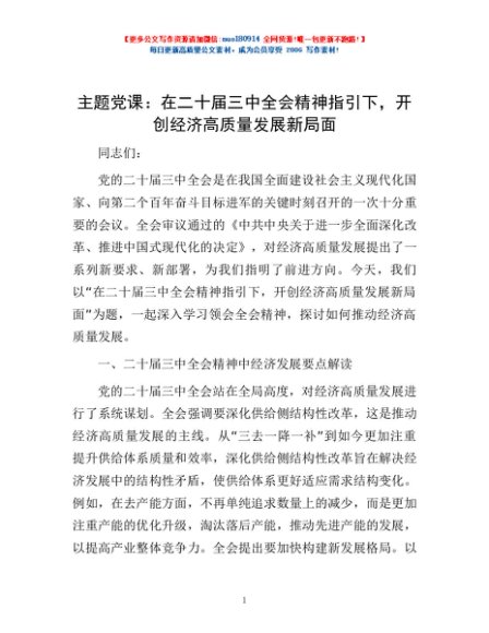 / 主题党课:在二十届三中全会精神指引下,开创经济高质量发展新局面