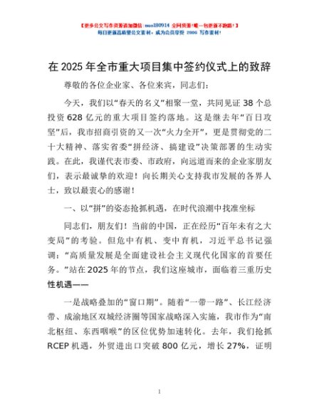 / 在2025年全市重大项目集中签约仪式上的致辞