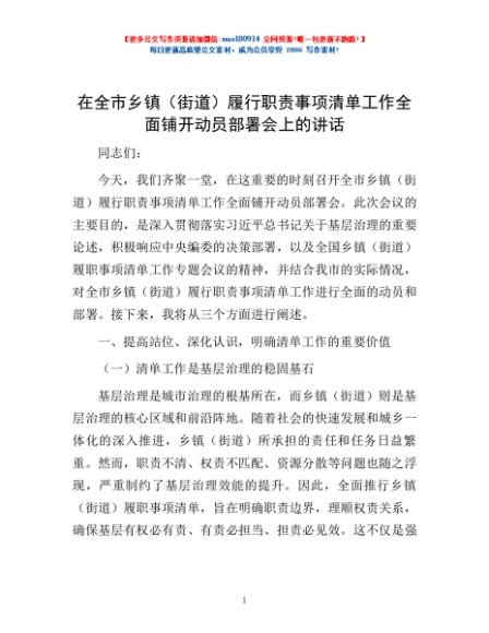 / 在全市乡镇(街道)履行职责事项清单工作全面铺开动员部署会上的讲话
