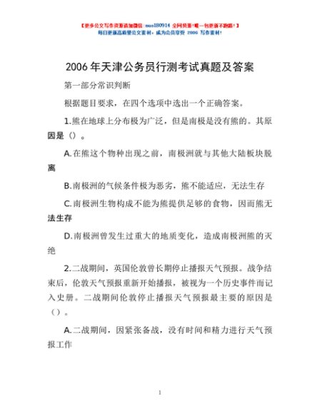 2006年天津公务员行测考试真题及答案