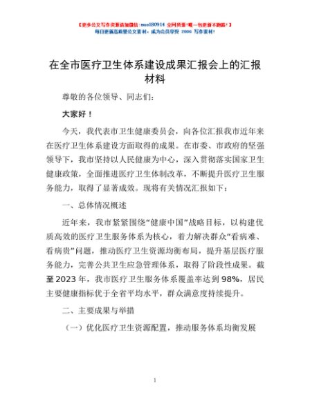 / 在全市医疗卫生体系建设成果汇报会上的汇报材料