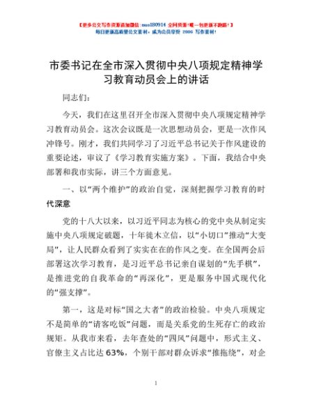 / 市委书记在全市深入贯彻中央八项规定精神学习教育动员会上的讲话