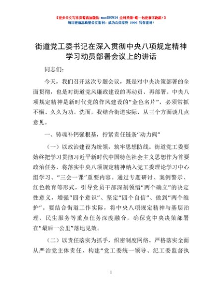 / 街道党工委书记在深入贯彻中央八项规定精神学习动员部署会议上的讲话